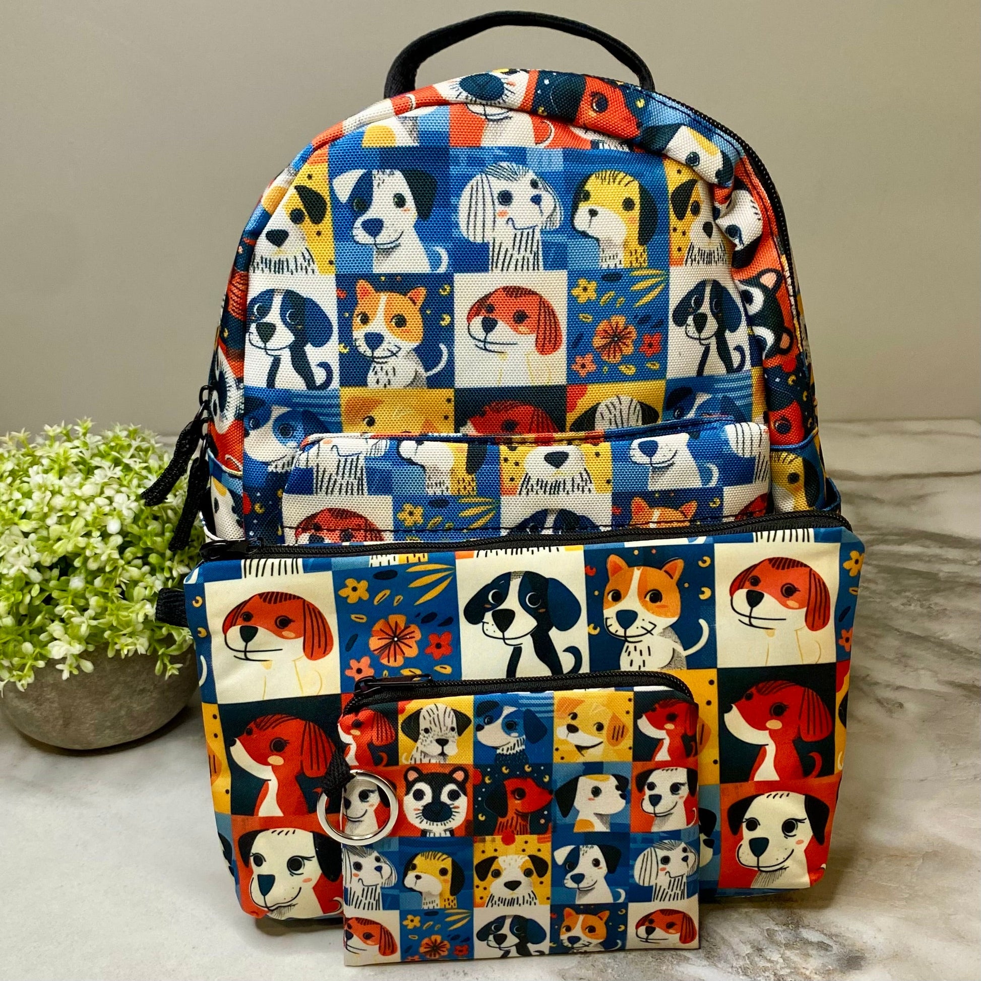 Mini Backpack, Pouch, & Mini Pouch Bundled Set - Dog Squares