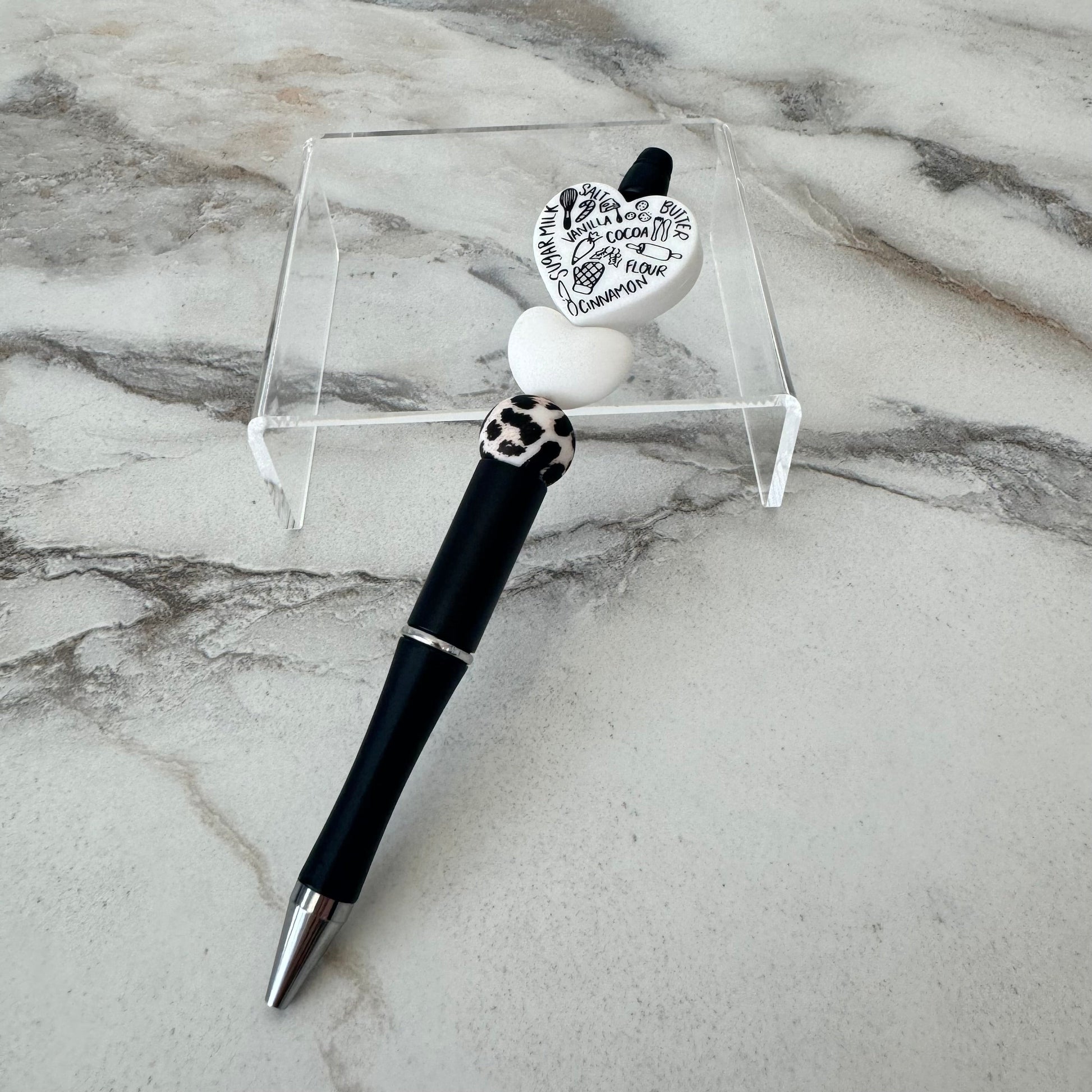 Adorable twist & click pens. 6” long, ballpoint, black ink, silicone beads and heart.